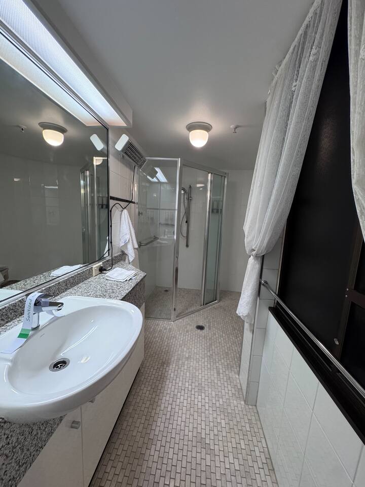 Guests have full access to the entire apartment and all facilities within the Capital Tower complex. Enjoy a private balcony with spectacular city and mountain views, a spacious lounge with elegant sofas, and a frame-style Smart TV for cozy movie nights. The large dining area seats six comfortably, and the fully equipped kitchen includes everything needed for home-cooked meals — oven, cooktop, microwave, dishwasher, coffee machine, and full-size fridge. The master bedroom features a comfortable king-size bed, large Smart TV, walk-in wardrobe, and ensuite with spa bath and shower. The second bedroom has a double bed, wardrobe, and Smart TV. The third bedroom offers two single beds (convertible to one king on request) and its own Smart TV. Two bathrooms each include a bathtub, shower, hair dryer, and complimentary shampoo, body wash, and conditioner. A separate laundry provides a washing machine, dryer, iron, and ironing board for convenience. Guests also enjoy access to the heated outdoor pool, sauna, gym, tennis and squash courts, and BBQ terraces with landscaped gardens. Two secure parking spaces and lift access to Level 4 are included.