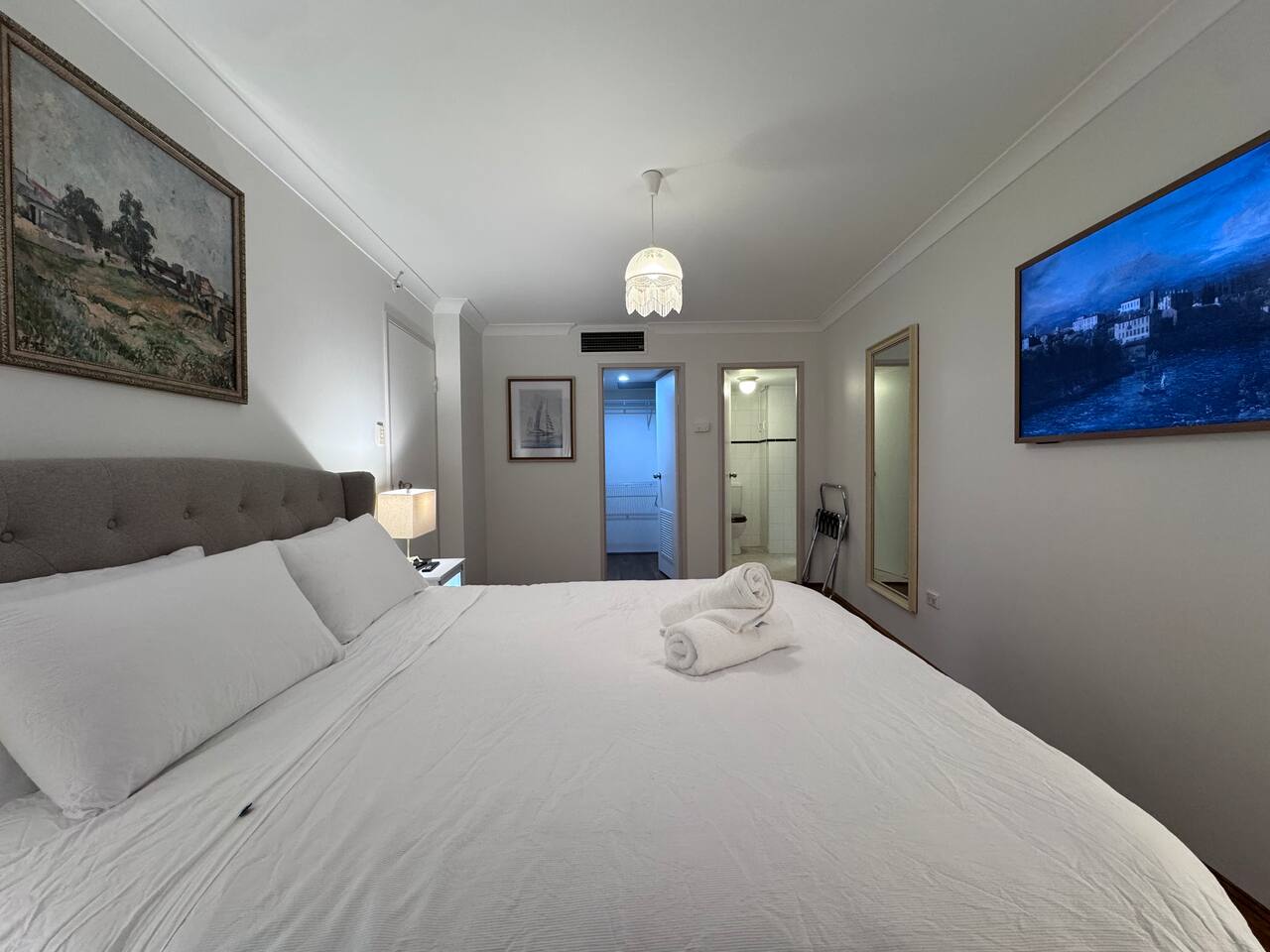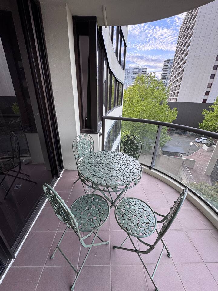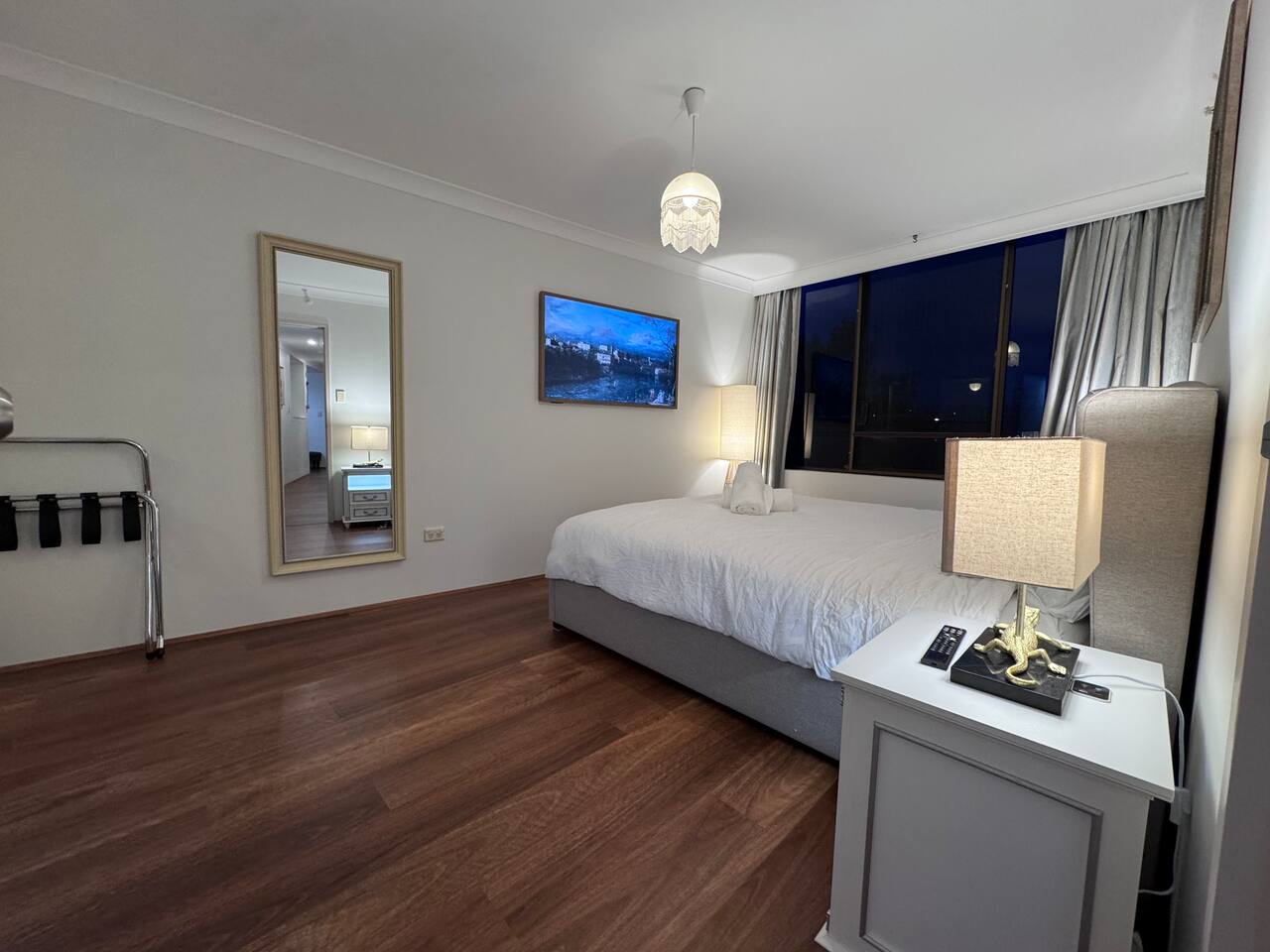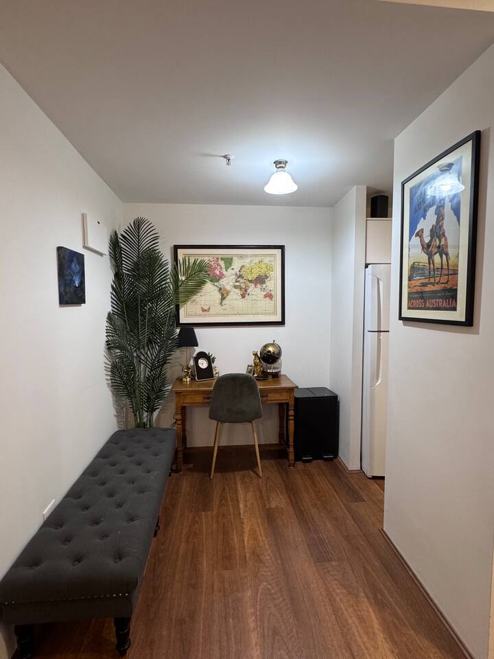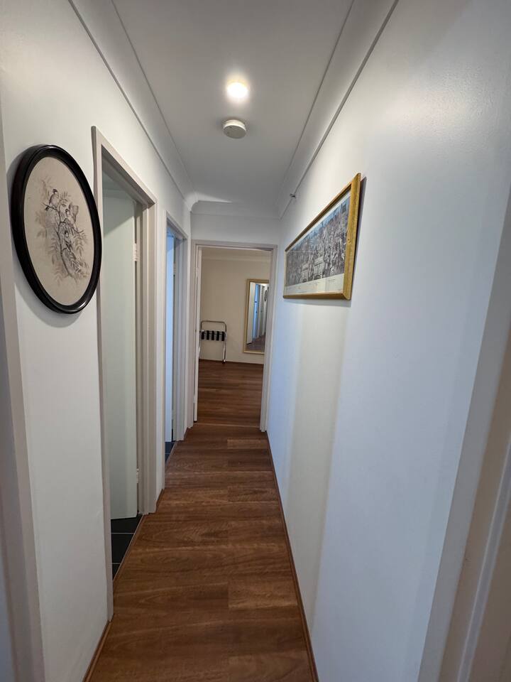 Gallery-style apartment with curated artwork and warm, modern finishes. Spotted-gum hybrid flooring throughout (no carpet) makes the apartment ideal for guests with allergies. Reverse-cycle air-conditioning in all rooms, including every bedroom and the living area, ensures year-round comfort. Sleeping arrangements: – Master bedroom: King-size bed – Bedroom 2: Double bed – Bedroom 3: Two single beds or one king bed (available on request) Additional sleeping option: For groups of 7–8 guests, a queen-size premium air mattress is available and can be set up in the living area upon request. The apartment features a separate laundry with washer and dryer. Each bedroom is equipped with a large Smart TV with streaming access, while the living area includes a frame-style Smart TV and premium soundbar, creating a relaxed gallery-like atmosphere. Located on a quiet lower floor overlooking landscaped gardens and the swimming pool, the apartment offers a peaceful outlook while still enjoying the convenience of a central CBD location.