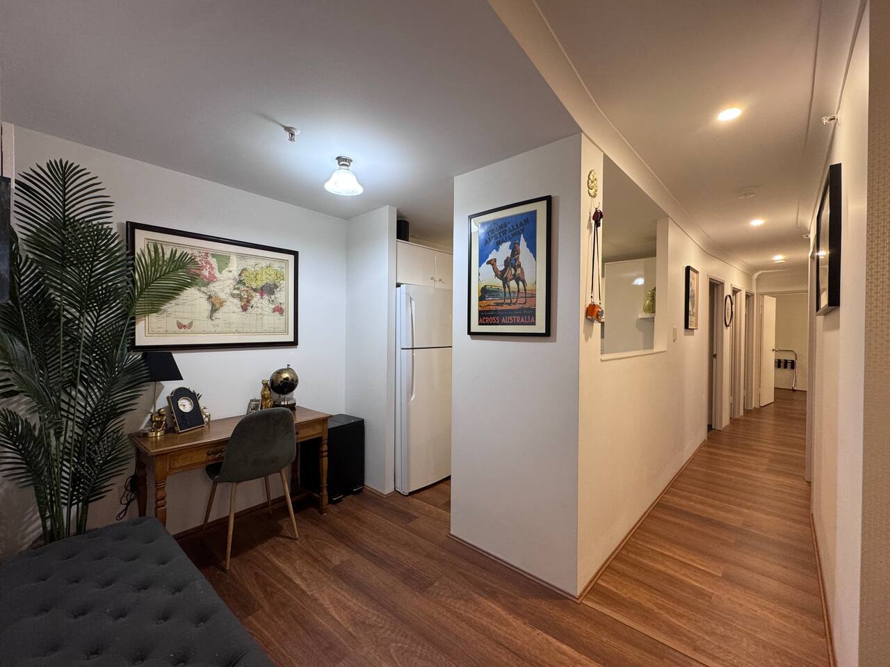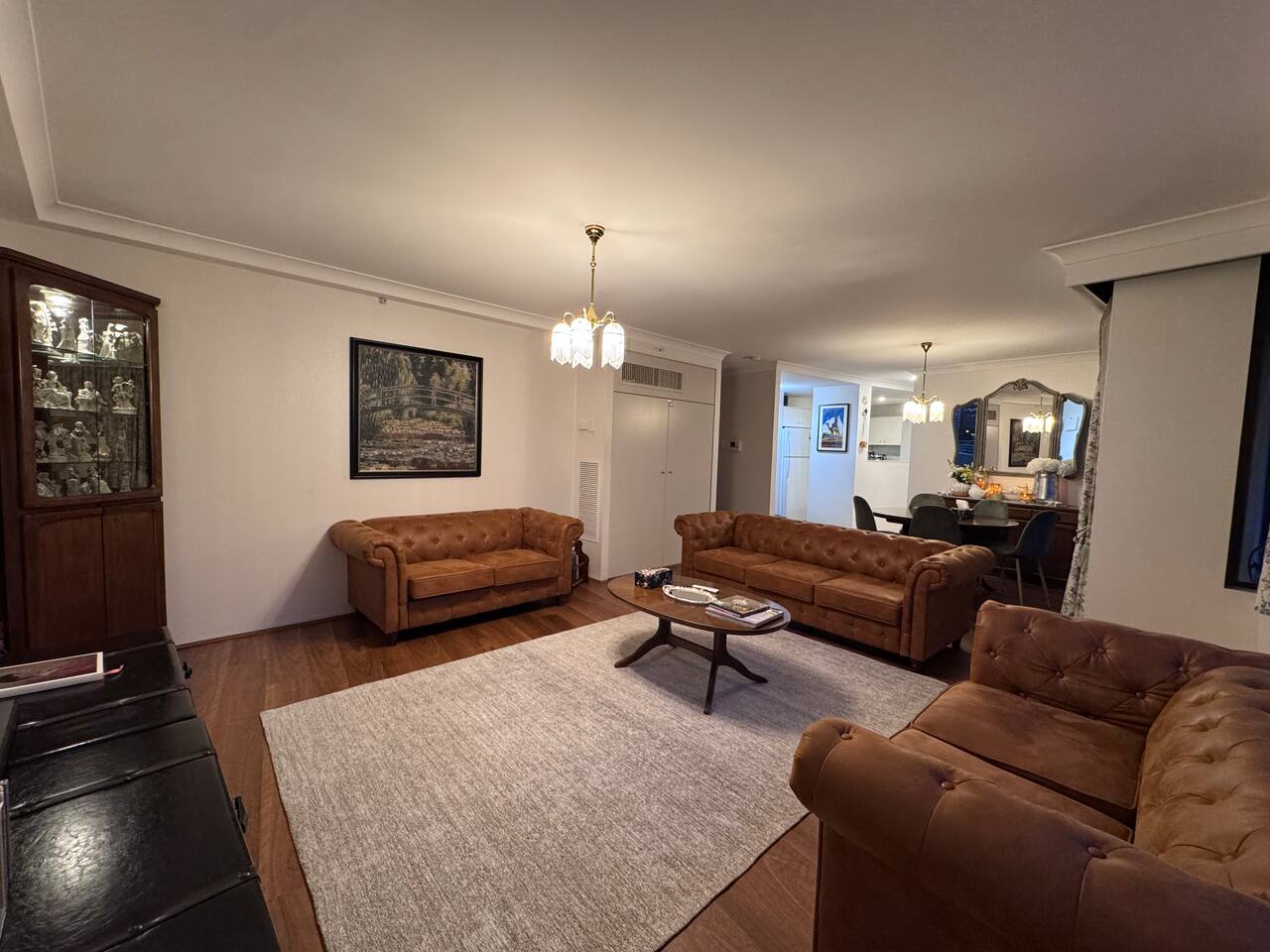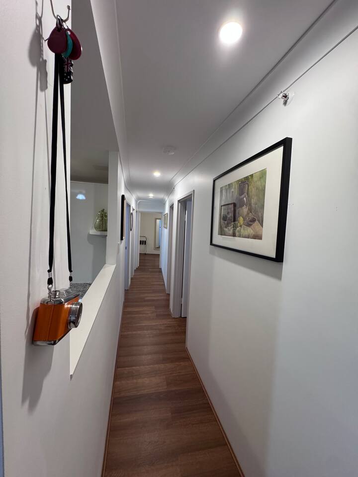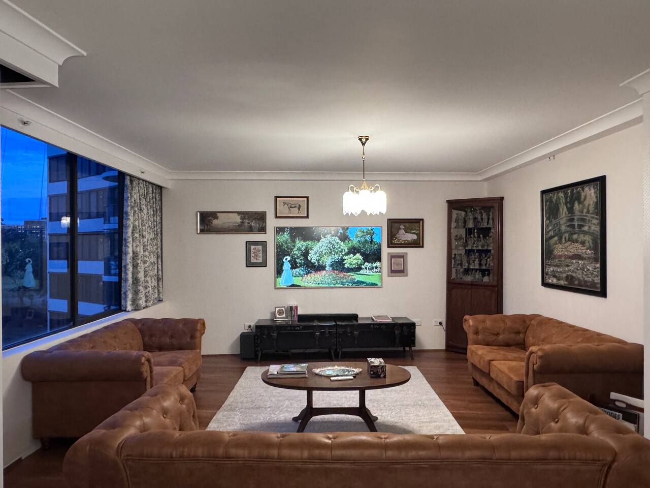 Gallery-style apartment with curated artwork and warm, modern finishes. Spotted-gum hybrid flooring throughout (no carpet) makes the apartment ideal for guests with allergies. Reverse-cycle air-conditioning in all rooms, including every bedroom and the living area, ensures year-round comfort. Sleeping arrangements: – Master bedroom: King-size bed – Bedroom 2: Double bed – Bedroom 3: Two single beds or one king bed (available on request) Additional sleeping option: For groups of 7–8 guests, a queen-size premium air mattress is available and can be set up in the living area upon request. The apartment features a separate laundry with washer and dryer. Each bedroom is equipped with a large Smart TV with streaming access, while the living area includes a frame-style Smart TV and premium soundbar, creating a relaxed gallery-like atmosphere. Located on a quiet lower floor overlooking landscaped gardens and the swimming pool, the apartment offers a peaceful outlook while still enjoying the convenience of a central CBD location.
